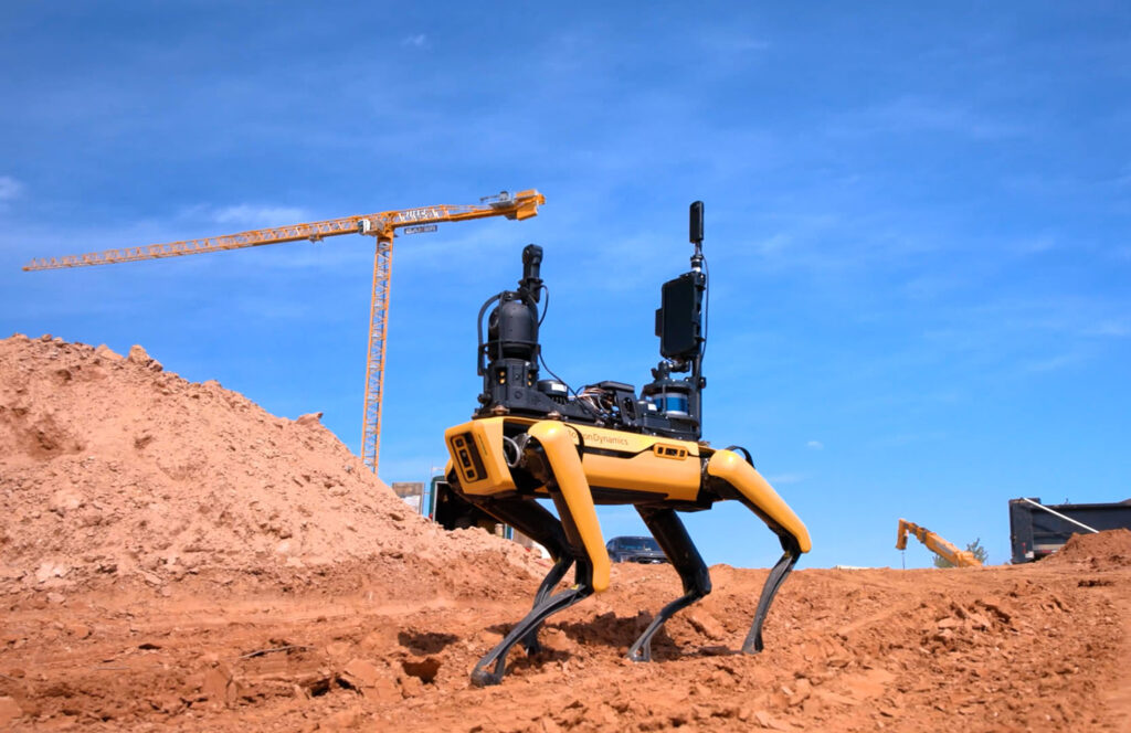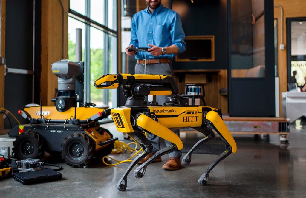 One of the tools at the center of this work is Spot, a four-legged robot outfitted with 360° cameras, laser scanners, and navigation sensors. Spot can autonomously walk jobsites to stream video, capture walkthroughs, create 3D laser scans, and even act as a virtual superintendent—giving HITT team members, clients, and partners the ability to check on progress from anywhere in the world.